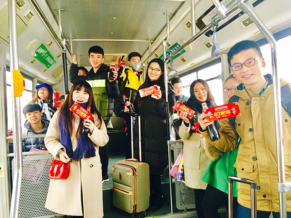 2017年1月13日“春運(yùn)大潮”正式開始,第一波主流人群就是學(xué)生,除了搶車票,擠候車廳,還有前奏就是擠公交,搶出租車去車站。為了讓同學(xué)們更順利的回家,可口可樂在鄭州5所高校打造了愛心專列巴士,持續(xù)5天往返于車站和學(xué)校之間,助力按時(shí)抵達(dá)?!斑€有什么比回家更開心的嗎?還有什么比,邊喝可口可樂邊看別人擠公交車更開心的嗎?愛心巴士好贊,讓我們的歸家路無比快樂和暖心!” 河南輕工業(yè)大學(xué)大三耿嘉尉同學(xué)高興的說著。