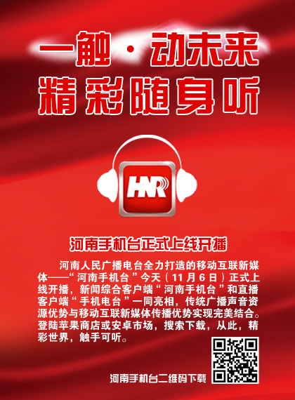 河南人民廣播電臺全力打造的移動互聯(lián)新媒體——“河南手機(jī)臺”今天(11.6)正式上線開播,新聞綜合客戶端“河南手機(jī)臺”和直播客戶端“手機(jī)電臺”一同亮相,傳統(tǒng)廣播聲音資源優(yōu)勢與移動互聯(lián)新媒體傳播優(yōu)勢實現(xiàn)完美結(jié)合。登陸蘋果商店或安卓市場,搜索下載,從此,精彩世界,觸手可聽。