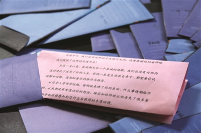 而最棘手則是一些父母與孩子之間有一些矛盾,“我們班一個男生因為高中時候爸媽管他管得太緊,以至于跟他們之間產(chǎn)生了很大的矛盾,他的父母知道有這樣一個可以給孩子寫信的機會之后,雖然很高興,但是也憂心忡忡,害怕孩子不愿意看他們的信,或者會因為這封信措辭不合適而加深對他們的誤解。我開導(dǎo)了他們很久,他們才愿意寫一封信,希望可以解開這個心結(jié)?!标惱蠋煴硎?,這位同學(xué)的父母寫的信更像是一封和解信,在字里行間的深深愧疚中,她也感受到了家長對于孩子的無奈和那一顆期望孩子快樂的心。