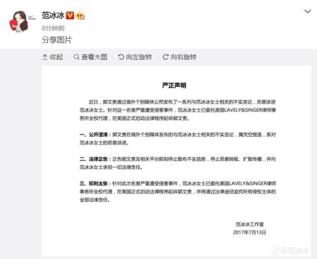 7月13日,范冰冰工作室針對(duì)郭文貴此前發(fā)布的與范冰冰有關(guān)的言論,做出“嚴(yán)正聲明”,并宣布將在美國啟動(dòng)訴訟程序起訴郭文貴。