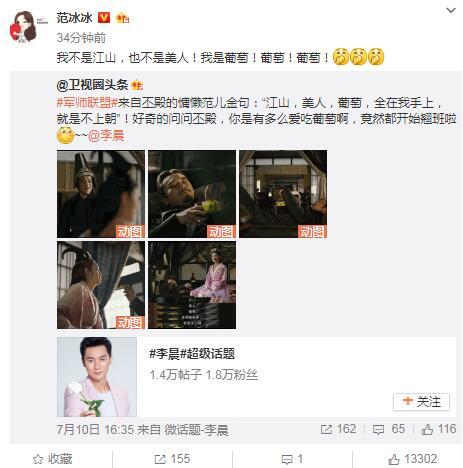 范冰冰看到后,轉(zhuǎn)發(fā)這條微博,還稱自己不是江山、也不是美人,只是一顆葡萄,緊接著一連四個感嘆號,把自己比作李晨愛吃的葡萄,不少網(wǎng)友看到覺得驚呆了,范爺也變得有點污。