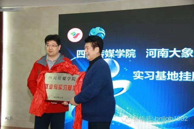 四川傳媒學(xué)院副院長王雷、河南大象融媒體集團副總裁李強為“四川傳媒學(xué)院·大象融媒就業(yè)實習(xí)基地”掛牌。
