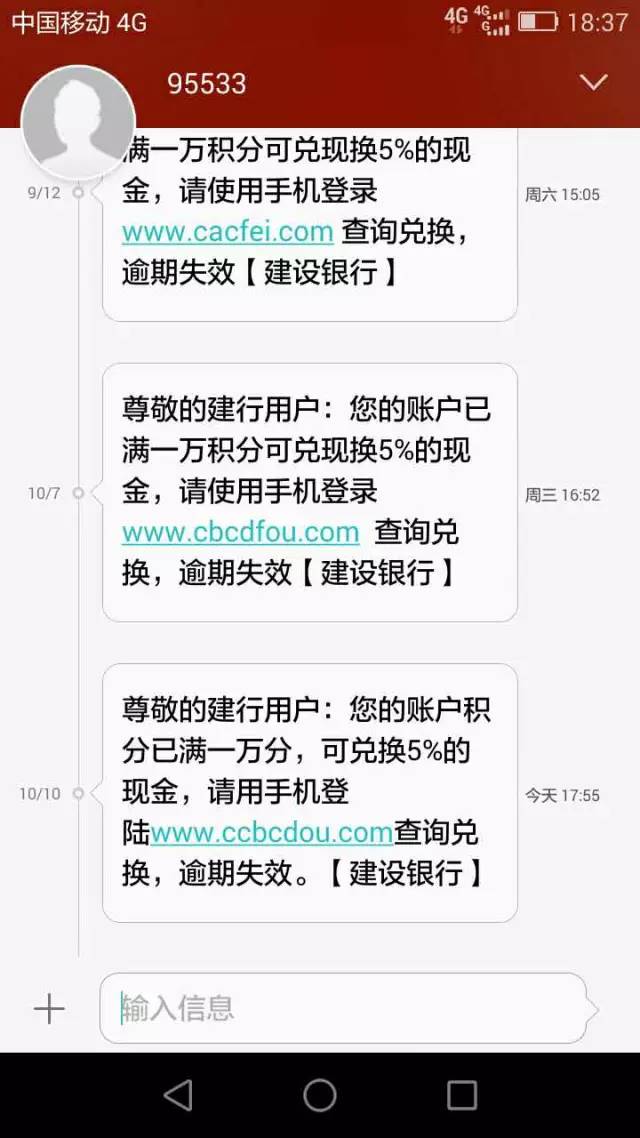 9月24日,受害人尹某,收到來自95533兌換建行賬戶積分的詐騙短信,點擊釣魚網(wǎng)站鏈接操作后被轉(zhuǎn)賬騙走5000元。9月28日,受害人盧某,收到95533兌換建行積分詐騙短信,點擊釣魚網(wǎng)站鏈接操作后被轉(zhuǎn)賬騙走3900元。
