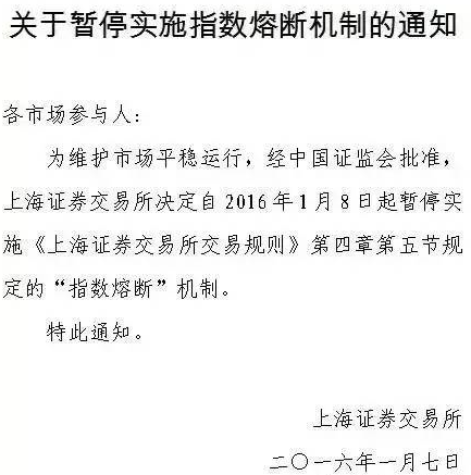 1月7日當(dāng)晚,上交所、深交所及中金所聯(lián)合發(fā)布通知稱決定暫停實(shí)施制度熔斷機(jī)制?!敖?jīng)中國證監(jiān)會(huì)同意,上交所、深交所及中金所決定于1月8日起暫停實(shí)施指數(shù)熔斷相關(guān)規(guī)定?!?/p>