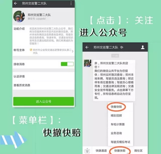 支隊科研所此次研發(fā)的交通事故快賠快撤功能,跳出了以往單方損失2000元以下的限制,只要在交警二大隊轄區(qū):嵩山路(含)嵩山路以西區(qū)域及中原區(qū)、西開發(fā)區(qū)全境,公共道路上發(fā)生的兩車事故,車輛能夠正常駕駛,沒有人員受傷,就可以通過“鄭州交巡警二大隊微信公共平臺”進(jìn)行快撤快賠處理。