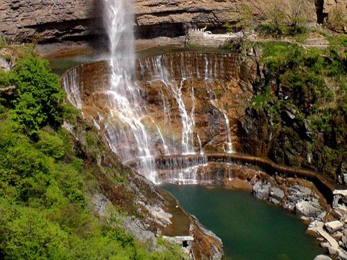 紅石河碧水橫溢、紅綠相映、色彩斑斕、明麗如畫(huà),因海拔1100米被譽(yù)為“太行天河”。從紅石河畔俯瞰,山谷幽深、流水潺潺,河水順著光潔平整、錯(cuò)落有致的紅石板流淌不息,直沖而下形成又一著名景點(diǎn)——天河大瀑布。紅石河的右畔是觀音洞,觀音洞里的泉水常年不斷、甘甜可口,用來(lái)泡茶增三分香,煮飯?jiān)黾尤痔穑F(xiàn)在敞開(kāi)供應(yīng),保你一杯解風(fēng)塵,二杯去疲乏,三杯大汗落。 八里溝的山,八里溝的水,甚至八里溝的每一塊石頭都引起世界的好奇。景區(qū)森林覆蓋率達(dá)90%,如今,八里溝景區(qū)已經(jīng)成為國(guó)內(nèi)很多前衛(wèi)、時(shí)尚的游客非常向往的一個(gè)人間天堂、世外桃源,也是春季旅游的經(jīng)典線路。