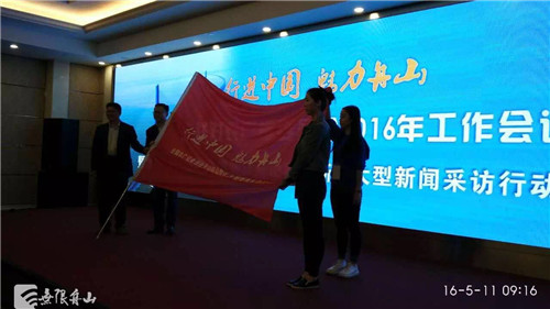 中廣聯(lián)對農(nóng)廣播委員會會長史敏、舟山市委常委、宣傳部部長、統(tǒng)戰(zhàn)部部長忻海平為“行進中國 魅力舟山”全國農(nóng)村廣播記者走進舟山大型新聞采訪行動授旗。中央人民廣播電臺記者劉旻嚖、舟山新聞廣播記者沈宇曄接旗。