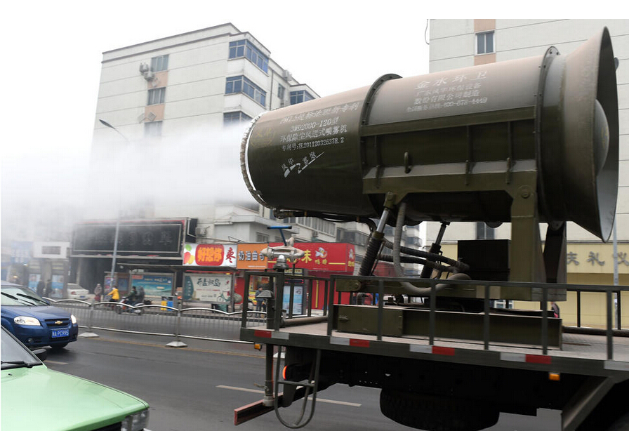 鄭州街頭現“防霾神器”霧炮車,據悉其噴射的水霧顆粒達到微米級,能有效分解空氣中的污染顆粒物、塵埃等,有效緩解霧霾。2015年01月05日,河南省鄭州市經三路上出現一輛大卡車,車上拉著一個大炮筒。工作人員說,這是一輛多功能抑塵車,俗稱“霧炮車”?!斑@輛車能裝10噸水,供霧炮噴射75分鐘?!惫こ處煆垏鴱娬f,霧炮車噴射的水霧顆粒達到微米級,能有效分解空氣中的污染顆粒物、塵埃等,有效緩解霧霾。