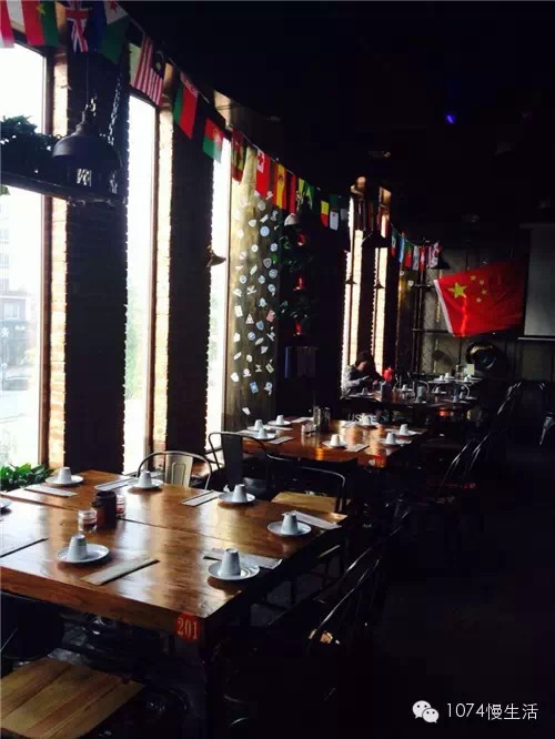 店內(nèi)的裝修風(fēng)格就有點(diǎn)搖滾重金屬的意思,果然,夜幕降臨,燈光一開,立馬就有酒吧的氛圍了。
