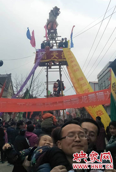 新鄭市觀音寺鎮(zhèn)太清村,新鄭、長(zhǎng)葛、禹州的三縣交界處。3月3日下午15時(shí)許,太清村的街上人山人海,水泄不通。各條街道上鑼鼓喧天,熱鬧非凡。多個(gè)舞獅團(tuán)隊(duì)開(kāi)始在高高樹(shù)起的架子上表演,地面上各種各樣的民間表演爭(zhēng)奇斗艷。