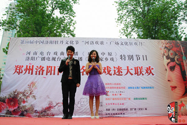 4月17日上午,在位于洛陽市中心、以體現(xiàn)周朝文化為主題的周王城廣場,“周公營建洛邑”雕塑旁,主辦方舉辦了一場別開生面的戲曲演唱會。來自鄭州、洛陽兩地的豫劇名家張?jiān)聵s、曾廣蘭、趙曉梅、王藝紅,著名演員徐俊霞、陳大華、劉亞林、曲韻、劉海功、沈萍,梨園春明星擂主張艷紅、謝憲笙等為來自全省各地的戲曲廣播《戲迷俱樂部》百余位戲迷和現(xiàn)場的廣大觀眾奉獻(xiàn)了精彩的戲曲唱段。藝術(shù)家們演唱的《洛陽橋》、《秦雪梅》、《七品芝麻官》、《對花槍》、《拷紅》、《收姜維》、《朝陽溝》、《倒霉大叔的婚事》、《小白鞋說媒》、《紅菊》等不同劇種、不同流派、不同行當(dāng)?shù)哪捴巳丝诘某?,博得觀眾一陣又一陣的掌聲,河南戲曲廣播主持人媛媛、李鋮表演的雙簧妙趣橫生,引得觀眾樂不可支。