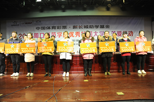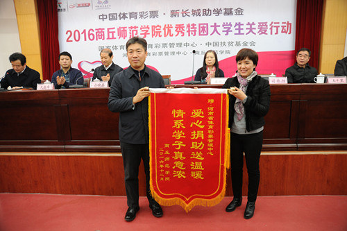 2016年12月7日、8日,中國體育彩票品牌公益項目“中國體育彩票新長城助學基金”2016年捐贈儀式分別在商丘師范學院和周口師范學院舉行。據(jù)悉,通過此次捐贈活動,河南省體育彩票管理中心共向兩個學校來自全國14省區(qū)的120名優(yōu)秀貧困大學生每人捐助5000元,幫助他們和他們的家庭,減輕學習生活中的經(jīng)濟負擔。