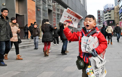 元旦小長假第二天,寒風凜冽,氣溫降到-5℃。南京新街口地鐵口川流不息的人流中,一個身穿紅色外套,背著青奧吉祥物“砳砳”的小男孩格外引人注目。他背著一只碩大口袋,報袋上印有“賣一份報紙捐一毛錢”字樣,一邊走一邊叫,“賣報,賣報——”他就是去年大年夜一祼成名的裸跑弟多多,這是他的鷹爸在對他進行財商訓練。據(jù)悉,這是鷹式教育“十商并舉”中的重要一環(huán)。