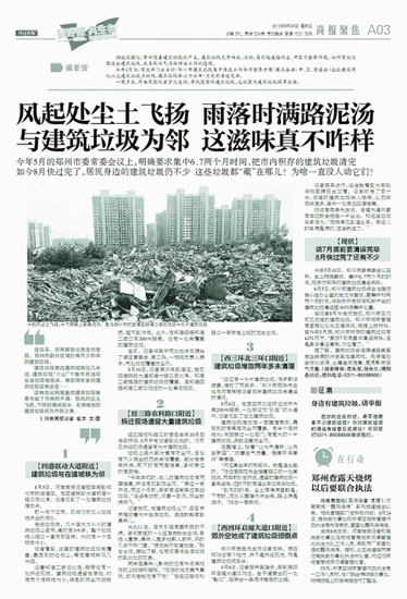 關(guān)于渣土車和建筑垃圾,《河南商報(bào)》一直都在關(guān)注。7月30日報(bào)道,《河南商報(bào)》曾曝光的3輛渣土車被“開除”出鄭州市場;8月26日至28日,《河南商報(bào)》刊發(fā)系列報(bào)道,關(guān)注鄭州市建筑垃圾問題。