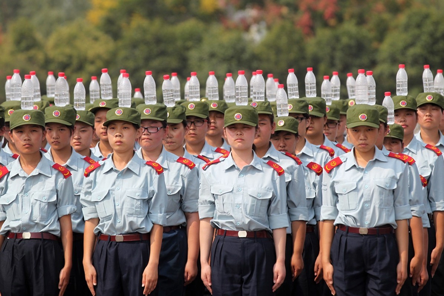 2015年9月17日,河南鄭州航空工業(yè)管理學院進行新生軍訓,記者軍訓現(xiàn)場發(fā)現(xiàn),該院在站軍姿、踢正步等軍訓項目上,引入卷尺、純凈水瓶等“裝備”,而且為“準空姐”訓練的科目中,還增加了如何盤發(fā)等項目。圖為2015年9月17日,鄭州航空工業(yè)管理學院的新生在頭頂?shù)V泉水瓶站軍姿。