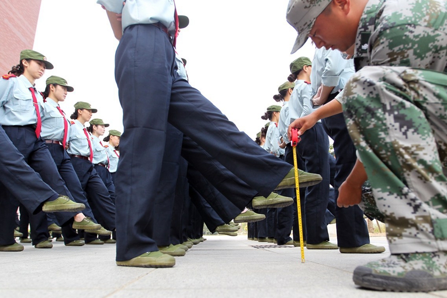 在大家普遍的印象里,學生軍訓主要就是練隊列、踢正步等,最多還有軍體拳、步槍射擊。昨天上午,記者在鄭州航空工業(yè)管理學院軍訓現(xiàn)場發(fā)現(xiàn),該院在站軍姿、踢正步等軍訓項目上,引入卷尺、純凈水瓶等“裝備”,而且為“準空姐”訓練的課目中,還增加了如何盤發(fā)等項目。
