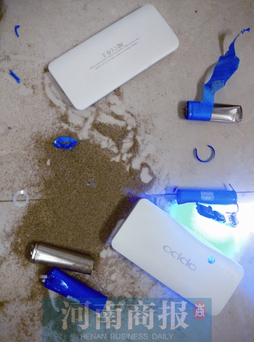 離開后,河南商報記者將充電寶拆開,看到充電寶中部分蓄電池與其他電池獨(dú)立分開,根本沒有導(dǎo)線,而沒有導(dǎo)線的電池里,裝滿了沙子。“oppo”充電寶中共有5節(jié)電池,有2節(jié)與電板通過導(dǎo)線相連,剩下光禿禿的3節(jié)電池“自成一派”。用錘子敲碎2節(jié),從電池里流出了細(xì)沙。