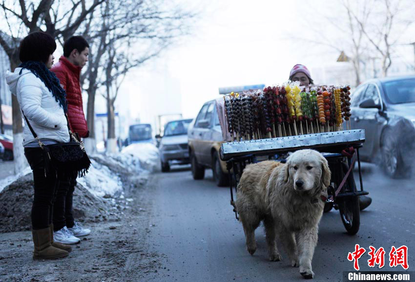 2月6日,在長春市一條繁華的街路上,一只小狗幫助身殘主人拉車賣冰糖葫蘆,成為長春冬日街頭一道感人的風(fēng)景線。據(jù)主人介紹,雖然自己身殘且貧窮,但并不想靠別人救濟度日,因此學(xué)會了制作冰糖葫蘆的手藝,并以此自食其力。而他養(yǎng)的這條小狗“大黃”也是對主人不離不棄,每日都會幫助主人拉車外出謀生。張瑤 攝