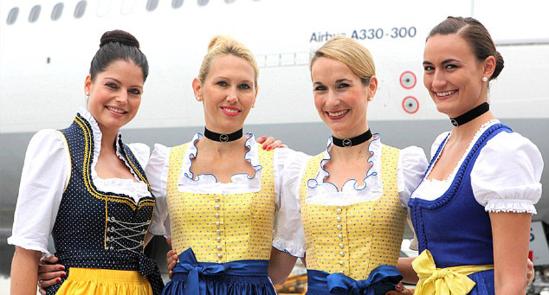 漢莎公司空姐2005年改穿這種巴伐利亞傳統(tǒng)制服,當(dāng)時(shí)恰逢每年一度的慕尼黑啤酒節(jié)。2014年,漢莎公司從慕尼黑前往北京、圣保羅以及墨西哥城的長途航班上,乘務(wù)員都穿起傳統(tǒng)服裝。空姐穿黃色緊身衣,上面印有藍(lán)花,配上藍(lán)白相間的裙子。