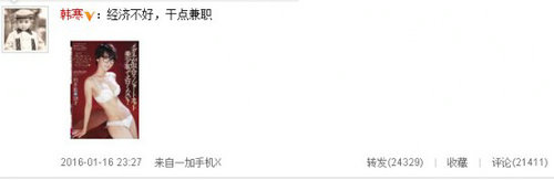 微博發(fā)布后,有網(wǎng)友留言道:“著名作家韓寒宣布下海,岳父變了,我要報警?!边€有網(wǎng)友調(diào)侃道:“岳父你開個價吧,小野我來照顧。”