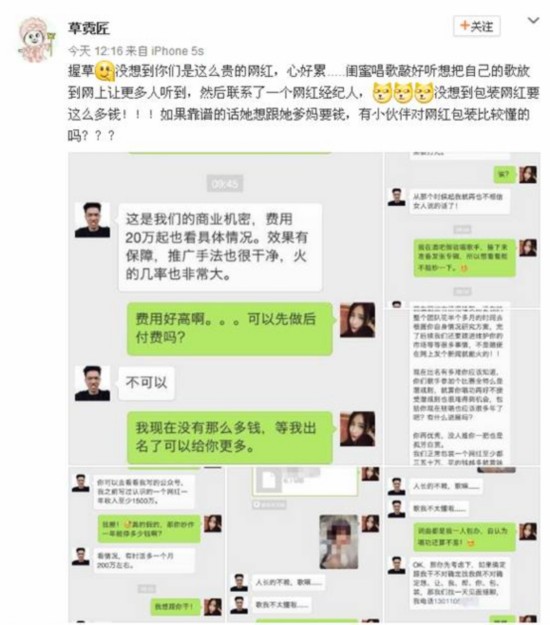 6月6日,某酒吧駐唱女歌手通過自己的微博發(fā)布了幾張聊天截圖。截圖內(nèi)容也是著實讓大家大吃一驚。聊天內(nèi)容大意是酒吧駐唱女歌手找了一位可以網(wǎng)紅經(jīng)紀人,期望他能夠把自己炒成網(wǎng)絡(luò)紅人,而每次推成功一次紅人,大概費用至少是20萬起。該網(wǎng)紅經(jīng)理自稱打造網(wǎng)紅每月收入百萬。
