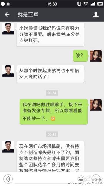6月6日,某酒吧駐唱女歌手通過自己的微博發(fā)布了幾張聊天截圖。聊天內(nèi)容大意是酒吧駐唱女歌手找了一位可以網(wǎng)紅經(jīng)紀人,期望他能夠把自己炒成網(wǎng)絡(luò)紅人,而每次推成功一次紅人,大概費用至少是20萬起。