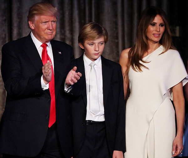 圖中為特朗普(左)、梅拉尼婭(右)和他們的兒子巴倫(中)。特朗普20日確認自己將入住白宮,但被問及梅拉尼婭和巴倫是否和他一起時,他說:“會很快的,等他本學年結束之后。