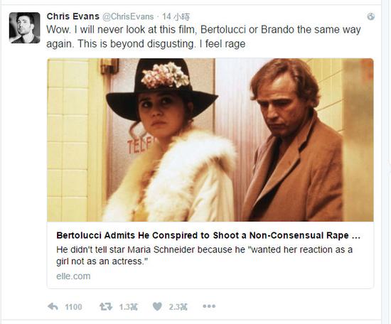 《美國隊長》克里斯·埃文斯(Chris Evans)也表示:“天啊,我再也無法像過去那樣看待這部片子、貝托魯奇或白蘭度,這已經(jīng)超越了惡心,我覺得很憤怒!”他的發(fā)文也引來許多網(wǎng)友認(rèn)同,連《歌喉贊》女主角安娜·肯德里克(Anna Kendrick)也在底下回應(yīng)表示,“施耐德女士之前曾在訪談中說過,‘我曾提起過這件事情,聽的人(男人們)還翻白眼’。”