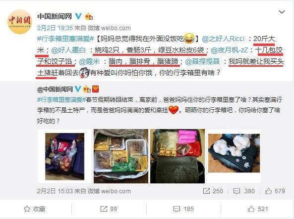 年,就這么過完了……@中國新聞網(wǎng)在微博上發(fā)起了一個(gè)過年返程催淚話題#行李箱里塞滿愛#,離家前,爸爸媽媽往你行李箱里都塞了啥?看了網(wǎng)友的回復(fù),有饅頭、大米、土雞蛋、餃子餡、燒雞……簡直笑到飆淚。其實(shí),塞滿行李箱的不是土特產(chǎn)、不是洋氣貨,是愛、是滿滿的牽掛與不舍!