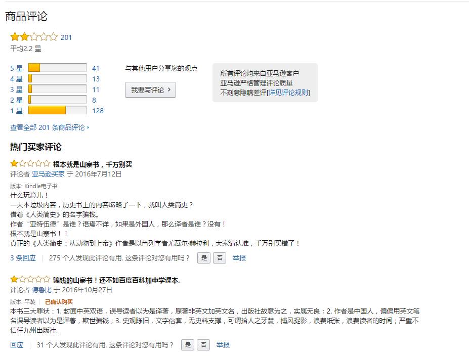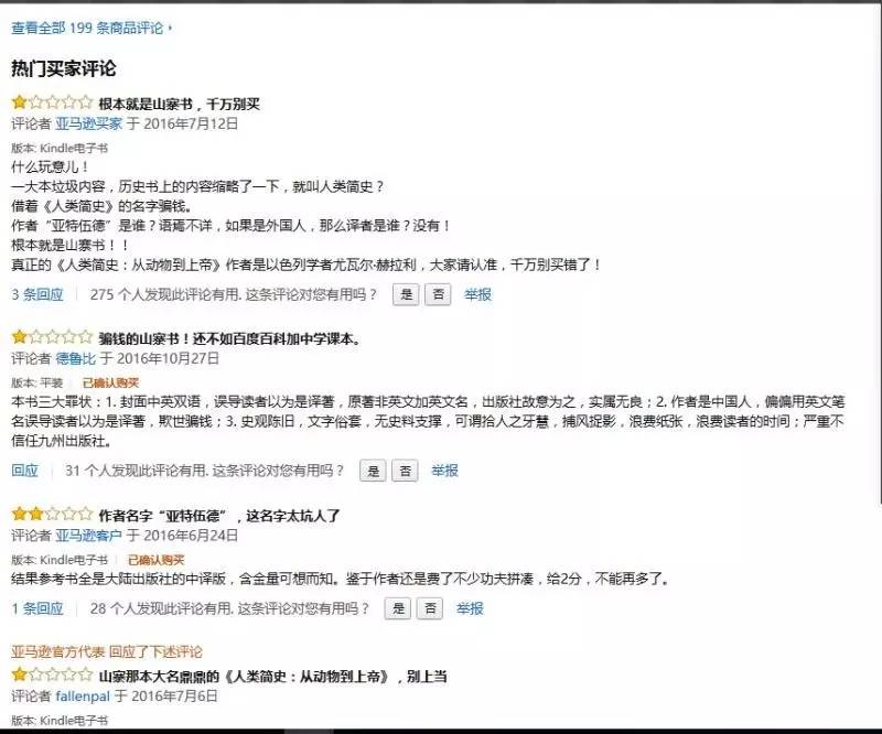 但是,這200條評論有54條好評,絕大部分評價時間集中于2016年5月15日與16日兩天,且不乏以“前500名評論者”為標(biāo)簽較有影響力的評論者的身影。其中某些好評更是“驢唇不對馬嘴”,被讀者識破為是對尤瓦爾《人類簡史》的評價。