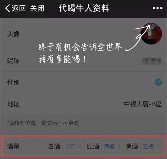 用戶在軟件中輸入或設(shè)置自己的位置,手機(jī)畫面的地圖上就會顯示出附近的 “代喝人”。這些“代喝人”在提供“代喝”服務(wù)之前,會提前在軟件上的個人信息中寫明自己的酒量、喜歡的酒類以及性別等基本信息。無論是誰都可以成為代喝人。