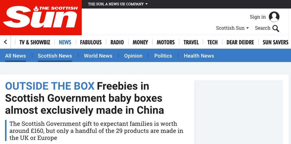 英國《太陽報》也發(fā)文稱,看到這么多的嬰兒用品均來自中國制造,有政界人士表示,嬰兒盒子計劃的受益者應該是中國。