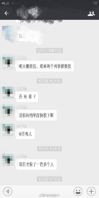 該網(wǎng)友提供的聊天截圖顯示,一個(gè)昵稱叫“大江東去”的人4月21日在班級(jí)微信群中說“明天繼續(xù)投,咱班每個(gè)同學(xué)都要投”“沒投的同學(xué)趕快投下”“現(xiàn)在才投了一百多個(gè)人”。在另一個(gè)名叫“首腦交流群”的微信群中,“大江東去”對(duì)班干部說:“誰不投了,實(shí)習(xí)把她弄到環(huán)境差的地方去”“把話給她們帶到,后果自負(fù)”“周天晚上一個(gè)一個(gè)統(tǒng)計(jì)”“讓那些裝聾作啞的人付出代價(jià)”。
