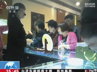 6月15日,央視“新聞直播間”節(jié)目中,游客在珠寶飾品店內選購商品。視頻截圖