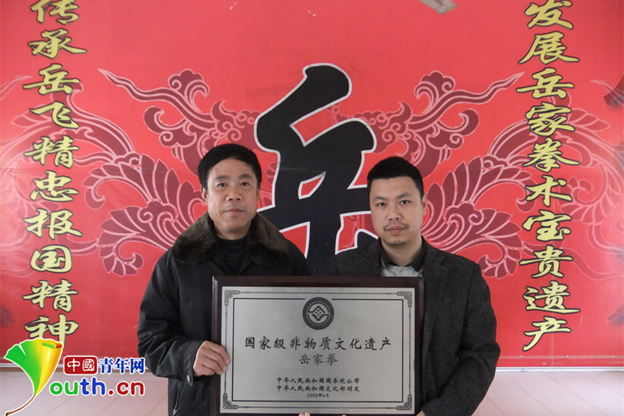 2008年,岳家拳正式被國務(wù)院批準(zhǔn)為國家級(jí)非物質(zhì)文化遺產(chǎn)。張業(yè)金(左)與張奇鋼(右)從北京捧回岳家拳非遺匾。