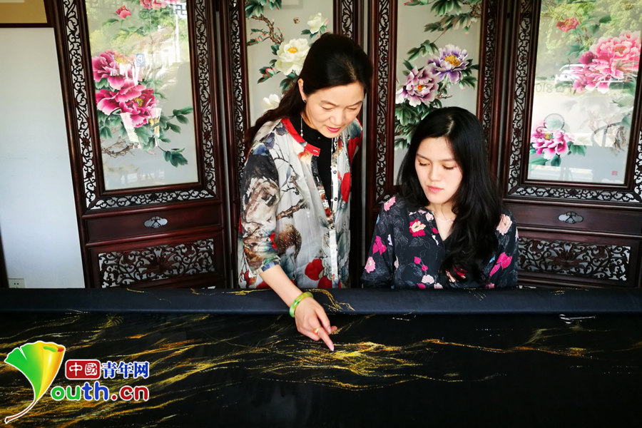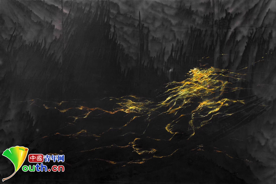 金線用蘇繡典型的平針繡法繡在真絲底料上,明暗金黃色從近處向遠(yuǎn)處延伸,燈光照射下,一如夜空中的萬家燈火。若有燈光照射,參觀者會(huì)發(fā)現(xiàn)整個(gè)底料上還暗藏一幅潑墨山水畫。
