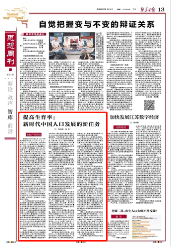 8月14日,江蘇省委機(jī)關(guān)報(bào)《新華日?qǐng)?bào)》在第13版“思想周刊·智庫(kù)”欄目刊發(fā)了劉志彪、張曄聯(lián)合撰寫(xiě)的題為《提高生育率:新時(shí)代中國(guó)人口發(fā)展的新任務(wù)》的署名文章。
