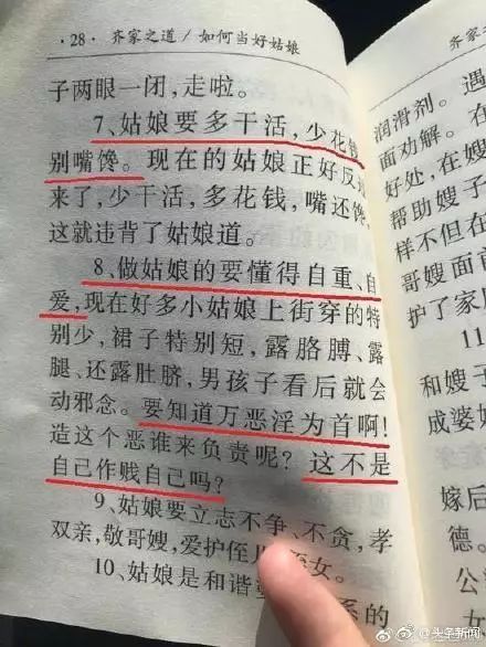 “姑娘要多干活,少花錢,別嘴饞,現(xiàn)在的姑娘正好反過(guò)來(lái)了,少干活,多花錢,嘴還饞,這就違背了姑娘道……”網(wǎng)友對(duì)小冊(cè)子上的一些話表示憤怒,認(rèn)為這是打著傳統(tǒng)文化的旗號(hào)禁錮人們思想的歪理,內(nèi)容歧視女性、挑撥家庭和睦、挑戰(zhàn)醫(yī)學(xué)常識(shí)。