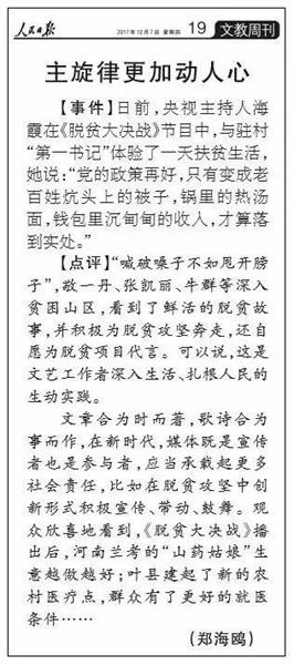 作為十九大的重要獻(xiàn)禮篇,《脫貧大決戰(zhàn)》第二季于10月11日正式播出。從第一季的“認(rèn)識貧困、了解貧困”,到第二季的“幫扶貧困、解決貧困”,固本求新,展現(xiàn)扶貧工作的現(xiàn)實意義和顯著成效,彰顯河南在全國脫貧攻堅中的責(zé)任和擔(dān)當(dāng)。節(jié)目播出之后,《光明日報》刊發(fā)《“土氣”背后的擔(dān)當(dāng)精神——關(guān)于大型公益扶貧節(jié)目<脫貧大決戰(zhàn)>》。《人民日報》發(fā)表評論《主旋律更加動人心》,稱贊《脫貧大決戰(zhàn)》是“深入生活、扎根人民的生動實踐”,國務(wù)院扶貧辦、中宣部、省委省政府、省委宣傳部等多個領(lǐng)導(dǎo)對節(jié)目給予充分肯定。