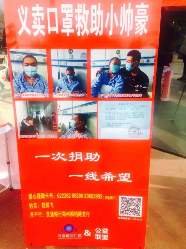 河南新聞廣播持續(xù)關(guān)注16歲白血病少年趙帥豪籌集50萬(wàn)元移植費(fèi)的進(jìn)展。由我們和公益同盟一起發(fā)起的口罩義賣活動(dòng)仍在進(jìn)行中。在花園路丹尼斯義賣點(diǎn),王女士帶著自己12歲的兒子柳義獻(xiàn)上了一份愛心。