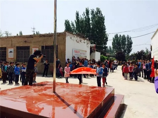 少先隊員向參加捐贈儀式的愛心代表人士敬獻(xiàn)紅領(lǐng)巾,并獻(xiàn)上孩子們花費(fèi)一下午時間親自采摘的鮮花,并舉行升國旗儀式。