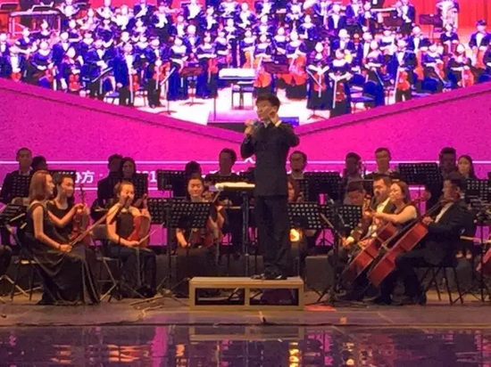 伴隨臺上指揮黃俊博的手勢起,河南愛樂樂團開始演奏交響樂《紅旗頌》。