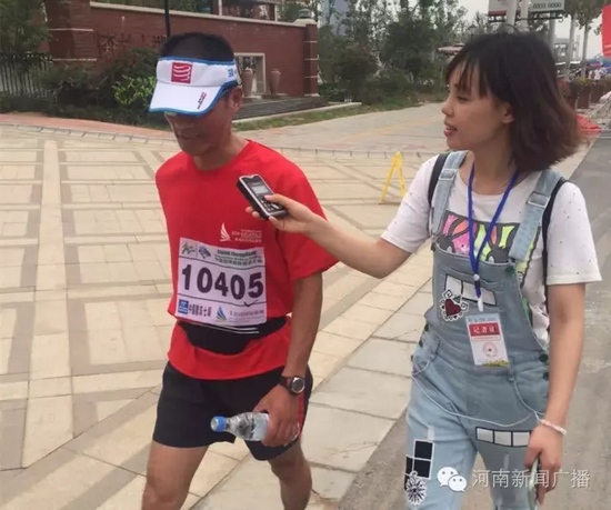 僅僅過(guò)了2小時(shí)20分,終點(diǎn)迎來(lái)第一位沖向終點(diǎn)的高先生,氣喘吁吁的他在接受我們采訪時(shí)依然腳步穩(wěn)健。