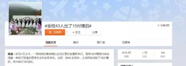 這條消息,最早出現(xiàn)在5月21日的微博和各大網(wǎng)站上,“全班一共43人,大學(xué)四年成就了15對情侶,畢業(yè)之際在重慶某景區(qū)舉辦集體婚禮。”網(wǎng)友直呼:這簡直不可思議。