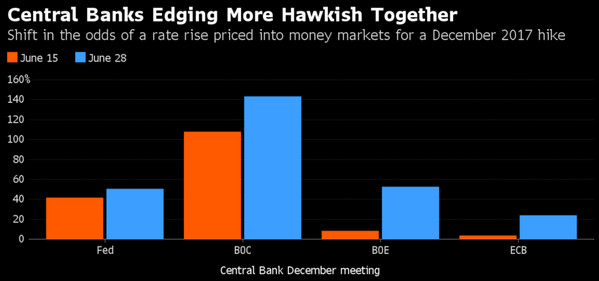根據(jù)隔夜指數(shù)掉期利率,英國央行和加拿大央行年底前很有可能跟隨美聯(lián)儲升息。即使是原本看似幾乎不可能的歐洲央行升息,如今幾率也逐漸增加。(圖表來源:彭博)