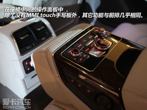 轉(zhuǎn)至后排,這里應(yīng)該同樣是車(chē)主們最為關(guān)注的,依靠長(zhǎng)軸車(chē)型多出的100mm軸距,后排的空間依舊不用擔(dān)心。而影音娛樂(lè)系統(tǒng)也同樣沒(méi)有被忽視,在座椅中間的操作面板中 ,除了沒(méi)有MMI touch手寫(xiě)板外,其它功能與前排幾乎相同。