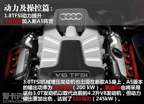 入門級的奧迪A5將采用1.8TFSI發(fā)動機,重新調(diào)教后,動力輸出從158馬力提高到168馬力。2.0 TFSI發(fā)動機的動力輸出依舊為211馬力(155kW)。3.0TFSI機械增壓發(fā)動機也出現(xiàn)在新款A5身上,A5版本的輸出功率為272馬力(200 kW)。奧迪S5也將采用這臺3.0T發(fā)動機以取代此前的4.2升V8發(fā)動機,但動力輸出更加出色,達到了333馬力(245kW)。變速箱方面,與以上幾款發(fā)動機匹配的將有6速手動、無級變速器、7速S tronic三種。