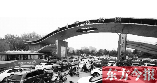 到了西門,記者搞清楚堵車的原因,竟是動(dòng)物園停車位緊張。一輛接一輛的車在門口排隊(duì)等著交費(fèi)進(jìn)入,車隊(duì)一直排到了花園路上。