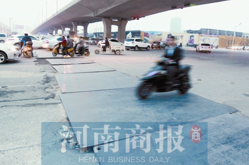 昨天下午,記者在現(xiàn)場(chǎng)看到,隴海高架橋黃河南路(西向東方向)下橋口南北兩側(cè),20余塊鋼板一字鋪開,鋼板路長(zhǎng)約50米、寬約2米,車輛經(jīng)過(guò)時(shí),鋼板與路面不斷發(fā)出沉悶的撞擊聲。