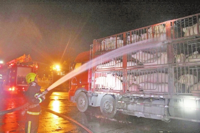 救援的消防官兵告訴大河報(bào)記者,現(xiàn)場需緊急救援的共有3輛運(yùn)豬車,約300頭豬。了解情況后,消防官兵隨即利用水槍向生豬噴水降溫,一個多小時,原來無精打采的生豬開始活泛起來,待高速通行司機(jī)連忙開往目的地。